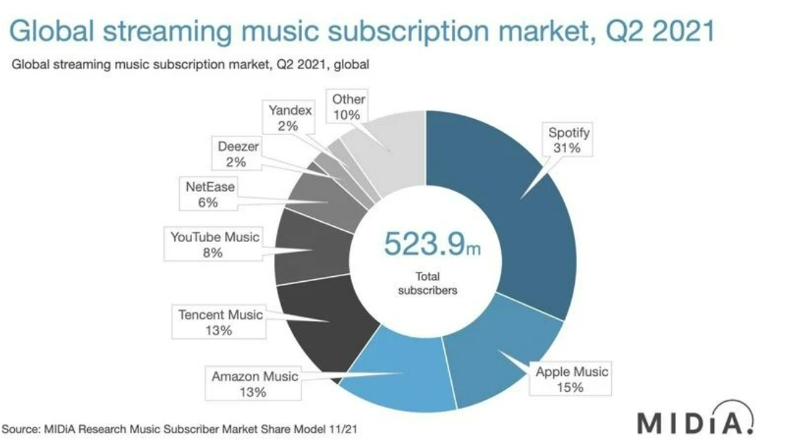 目前,腾讯音乐拥有的在线音乐付费用户数稳居全国第一。在全球市场而言,7620万的付费用户数也是一个不容小觑的数字。Midia Research数据显示,截至2021年第二季度,腾讯音乐在全年音乐市场的占有率达到了13%,在线音乐付费用户数稳居全球第三。