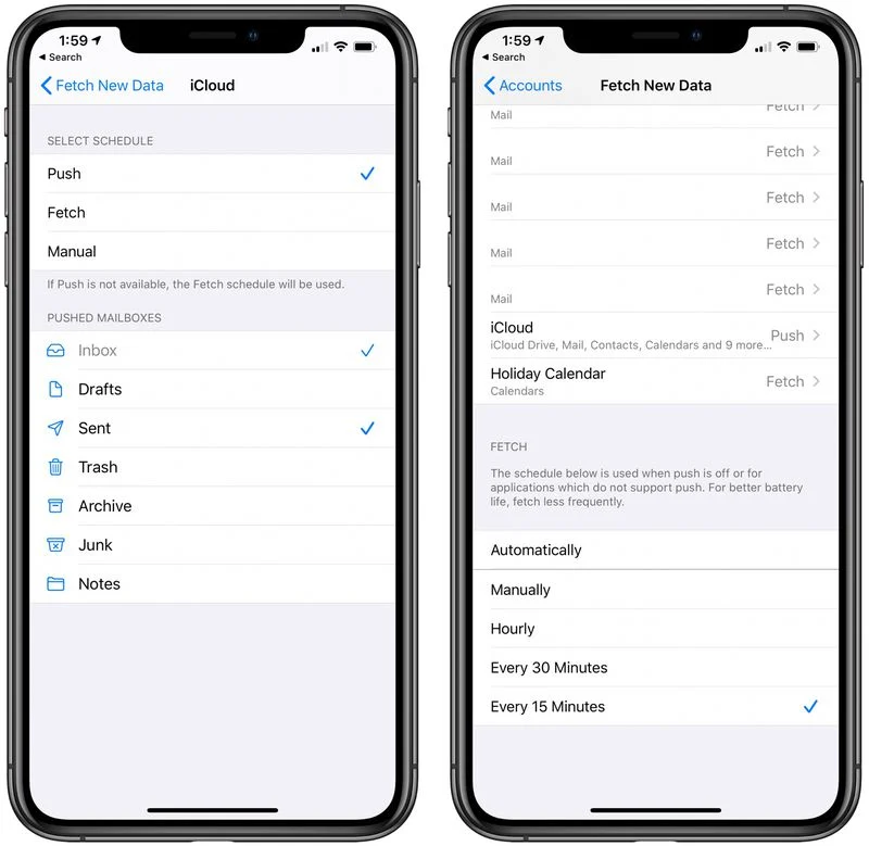 调整 Fetch 设置以在检查新邮件之前有更长的时间间隔有助于节省电池寿命,关闭 Fetch all together 以支持手动检查,即仅在打开 Mail 应用程序时下载新邮件。